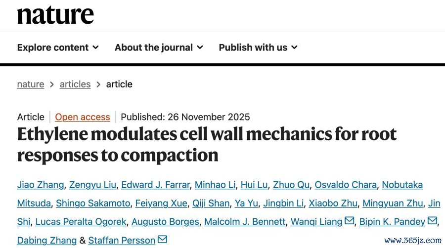 近日,上海交通大学生命科学时代学院张大兵和梁婉琪评释团队齐集丹麦哥本哈根大学斯塔凡·佩尔松(Staffan Persson)评释团队、英国诺丁汉大学马尔科姆·J·本内特评释(Malcolm J. Bennett)团队在外洋顶尖学术期刊《当然》上发表题为《乙烯通过调控细胞壁力学特点介导根系反应泥土板结》(Ethylene modulates cell wall mechanics for root responses to compaction)的最新沟通,初度揭示了植物根系若何愚弄工程学旨趣妥当板结泥土:通过主动反应积蓄的乙烯,细巧调控细胞壁厚度,从而促进根系增粗,提醒穿透才能以妥当泥土板结。