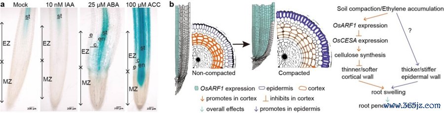 沟通团队从上千个水稻基因中找到了重要调控因子OsARF1。当根系遭受板结泥土时,泥土中积蓄的气体激素乙烯会激活OsARF1,使其从根系中心扩散到皮层细胞,拦截纤维素合成酶基因的抒发,最终导致皮层细胞壁变薄变软,根系得以径向彭胀变粗。沟通团队通过进一步实验考证发现,缺失OsARF1的突变体根系纤细、无法彭胀;而过量抒发OsARF1的植株根系粗壮、穿透力强。因此,乙烯-OsARF1-纤维素合成酶这条调控链路,恰是植物应付泥土板结的重要计策。