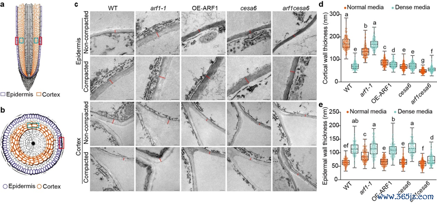 早期沟通发现,当根系遭受板结泥土时,会发生径向彭胀增粗,这种妥当性反应主要由皮层细胞层扩张脱手。沟通忖度,皮层细胞彭胀的经由主要通过增大细胞壁的弹性来兑现。那么,植物是若何反应泥土硬度来动态地迁徙自己细胞壁的塑性来匡助根系穿透板结泥土的呢?